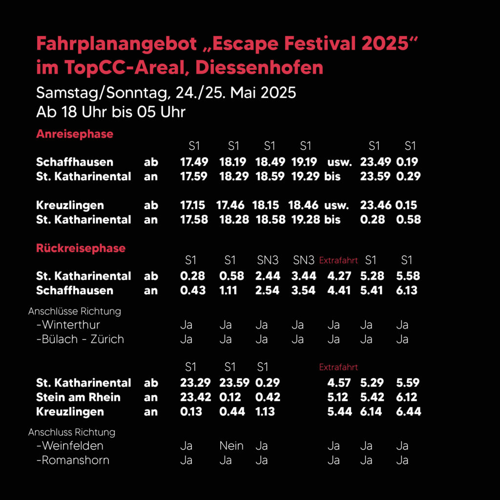 Wir empfehlen allen Gästen, mit öffentlichen Verkehrsmitteln zum Festival anzureisen. Die Thurbo AG bietet ausgezeichnete Verbindungen, sodass ihr jederzeit bequem das Festivalgelände erreichen könnt.